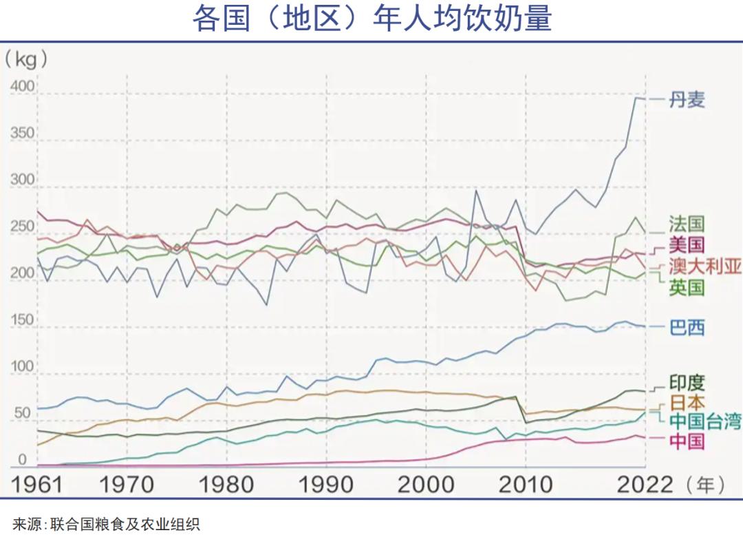 2022年,我国居民乳制品消费量(折合生鲜乳)为42千克,仅有世界平均水平的1/3,亚洲水平的45.3%,欧美发达国家的1/7,未来仍有很大的消费增长空间。