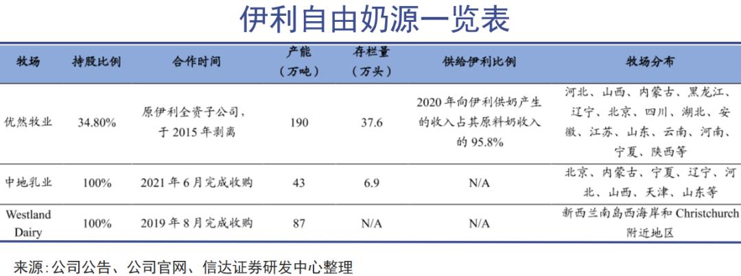 伊利旗下的优然牧业,是国内最大原奶供应商,产能规模国内第一,原奶产量占全国近10%。借助伊利集团资本支持,优然牧业先后收购了赛科星、恒天然中国牧场以扩大产能。