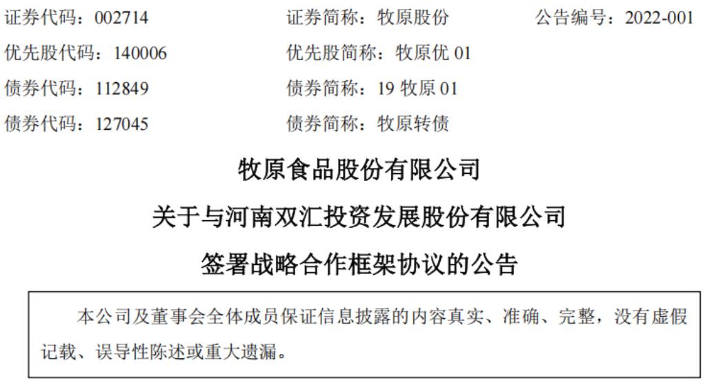 2022年1月1日,牧原股份与双汇发展在河南省漯河市签署了《双汇牧原战略合作框架协议》。根据牧原发布的公告,双方将“以生猪购销为依托,通过完善产业链、提升价值链、打通供应链,提高产品质量、效益和市场竞争力,实现共同高质量发展。”