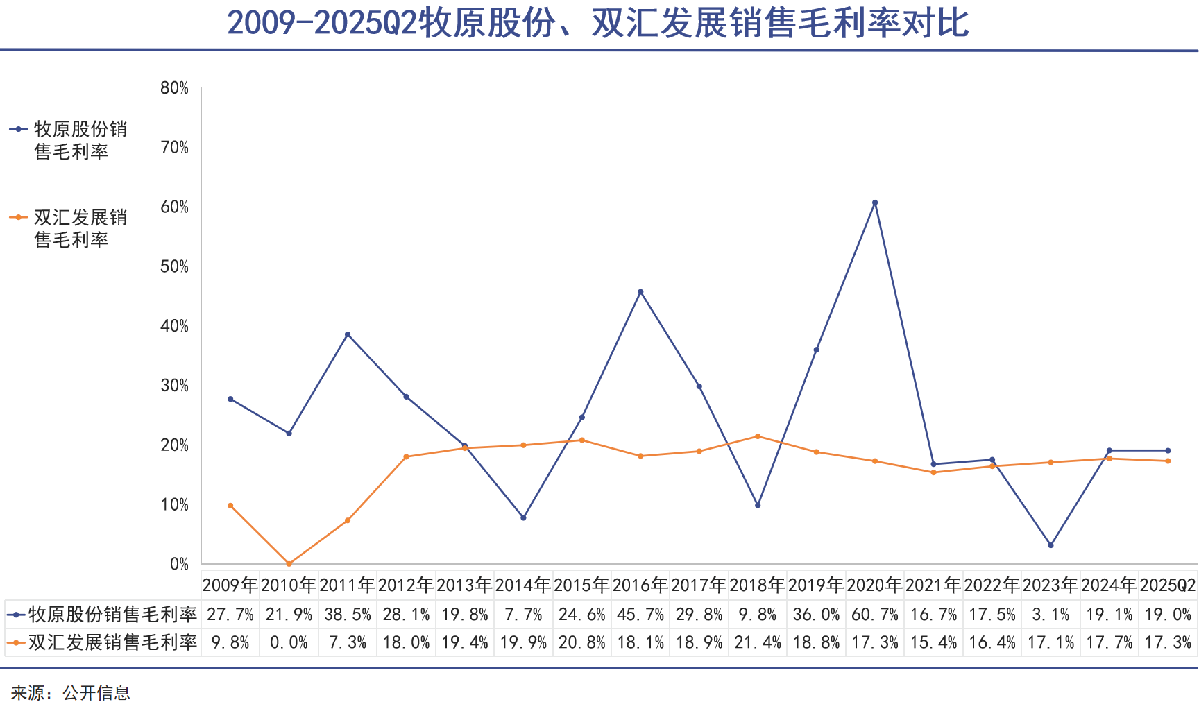 从2009年至今年上半年这十几年间,牧原股份仅有三个年度的毛利率低于双汇发展。尤其是在2020年,牧原毛利率高达60.68%,净利润一度飙升到274亿元,远非双汇发展可比。