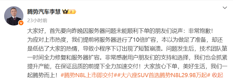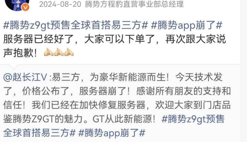 而有意思的是,“服务器问题”在此前腾势Z9 GT、腾势N9上市过程中,在赵长江的口中曾屡屡出现。腾势N9上市后,赵长江曾说,“发布会后短时间内,N9订单迅速飙升,虽然增加10倍的服务器但也有一定压力。”去年8月20日,腾势Z9 GT上市后,其称,“今天技术发了、价格公布了、服务器崩了。”