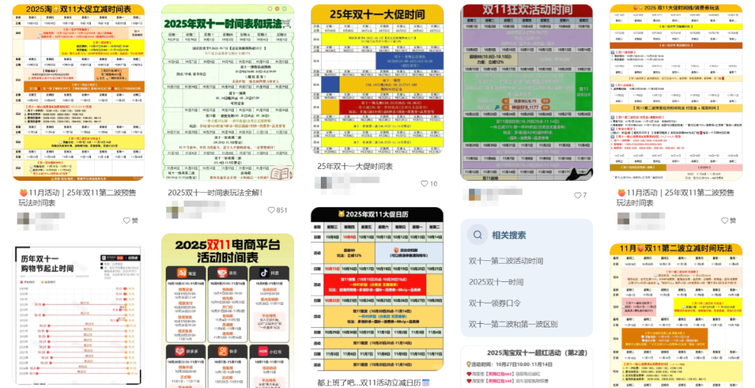 大多数消费者参与双 11 的第一步,都是先打开各类社媒,搜索“今年双 11 时间表”。因为他们需要从海量、碎片、多变的信息中,提炼出一份行动指南。