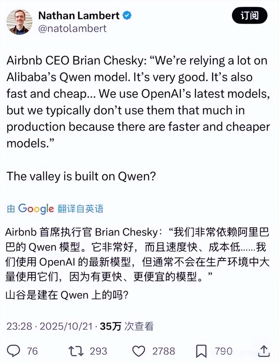 其价值很快得到了来自产业顶端的认可,英伟达CEO 黄仁勋曾公开指出,Qwen 已占据全球开源模型市场的大部分份额;爱彼迎CEO 布莱恩·切斯基则坦言公司正“大量依赖 Qwen ”,因其在部分场景下比 OpenAI 的模型“更快速、更出色”。
