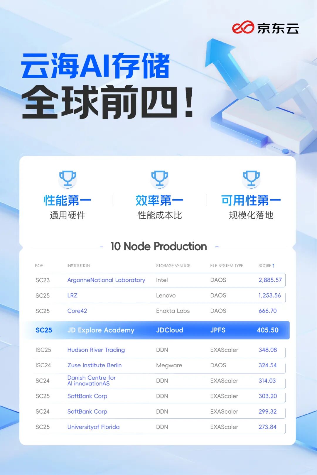 近日,在全球权威的存储性能评测 IO500 榜单中,京东云海存储跻身全球前四,并位列国产自研第一。这项成绩的一个关键背景在于,它是目前全球性能最强的、基于通用 NVMe 架构的 AI 存储系统,同时也是全球最大规模基于国产 CPU 的 AI 存储实践。