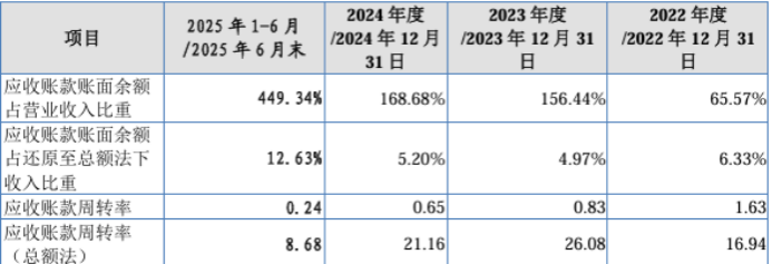 各期,应收账款周转率(总额法)分别为16.94次、26.08次、21.16次和8.68次,2025年上半年周转率较2024年末继续下降。