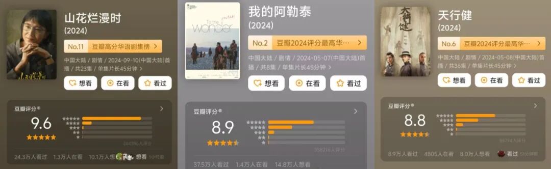 国产长剧近年有不少获评豆瓣高分,但近十年评分最高国产剧《山花烂漫时》,腾讯站内最高热度为22357,云合评级仅为A+;豆瓣8.9分的《我的阿勒泰》爱奇艺站内热度未破 7500;豆瓣8.8分的《天行健》腾讯站内最高热度不到21000。