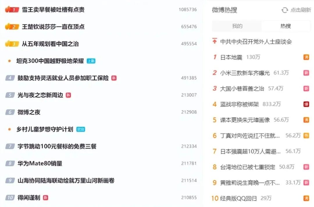 我们截取了近期微博热搜主榜话题情况,可以看到,改动后的热搜主榜垂直内容有固定的席位。像光与夜之恋、华为Mate80、雪王等等行业话题也有冲到热搜前十的能力。尤其像#小米三款新车齐曝光#热度值低于#蓝战非称被绑架#,但却能够获得更高的榜单位置。