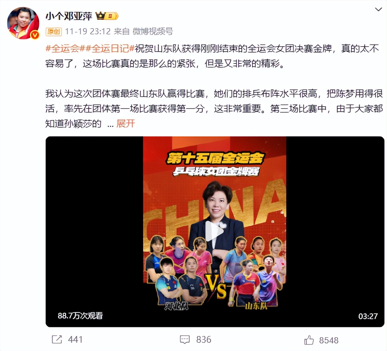 以体育垂类为例,它本身在微博有完整的垂直生态。比如专业媒体负责事实与判断的产出;KOL做多角度解说和二创;运动员发表各类点评、回应或者社交互动;用户实时关注赛程积极参与讨论。恰逢全运会刚刚落幕,作为解说的世界冠军邓亚萍,就在微博全程更新了自己的#全运日记#,对每日赛果做了详细点评。