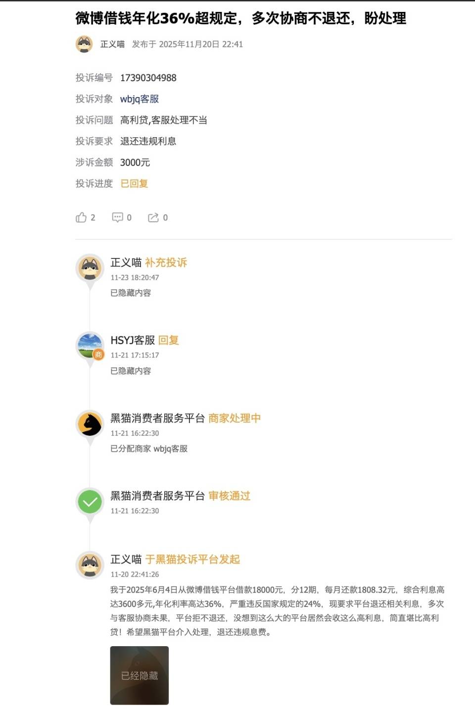 微博借钱被指综合利率高得惊人,远超助贷新规所设定的24%年化红线。据多名借款人反映,在微博借钱平台上借款,实际承担的综合年化成本普遍在18%-24%之间,甚至不乏高达36%的极端案例。据黑猫投诉平台数据,11月20日,一名借款人投诉称:在微博借钱18000元,分12期,每期还款1808.32元。经计算,两笔借款的综合利率均达到36%,包括利息加担保费,远超新规规定的24%红线。