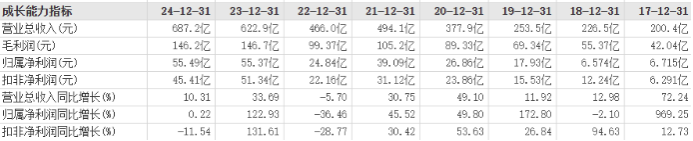 查询Wind及东财数据显示,2017年-2024年,传音控股实现营收分别为200.4亿元、226.5亿元、253.5亿元、377.9亿元、494.1亿元、466.0亿元、622.9亿元以及687.2亿元,同比增长分别为72.24%、12.98%、11.92%、49.10%、30.75%、-5.70%、33.69%以及10.31%;归母净利润分别为6.715亿元、6.574亿元、17.93亿元、26.86亿元、39.09亿元、24.84亿元、55.37亿元以及55.49亿元,同比增长分别为969.25%、-2.10%、172.80%、49.80%、45.52%、-36.46%、122.93%以及0.22%。