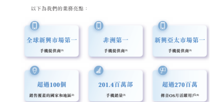 据悉,自2013年成立以来,公司即深耕以非洲为代表的新兴市场。凭借着领先的市场占有率和广泛的品牌影响力,在手机行业内有着“非洲之王”的美誉。基于公司在非洲市场所积累的对用户需求的深刻洞察,能够在不同的新兴市场复制成功范例。公司已在主要新兴市场乃至全球市场取得领先的市场地位。