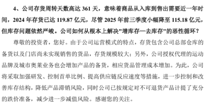 在12月8日的投资者交流活动上,有投资者提出:“财报显示公司存货周转天数361天,但未详细说明存货结构、周转效率改善措施及具体时间表。作为投资者,我们如何能更清晰地评估公司库存管理的真实进展?”