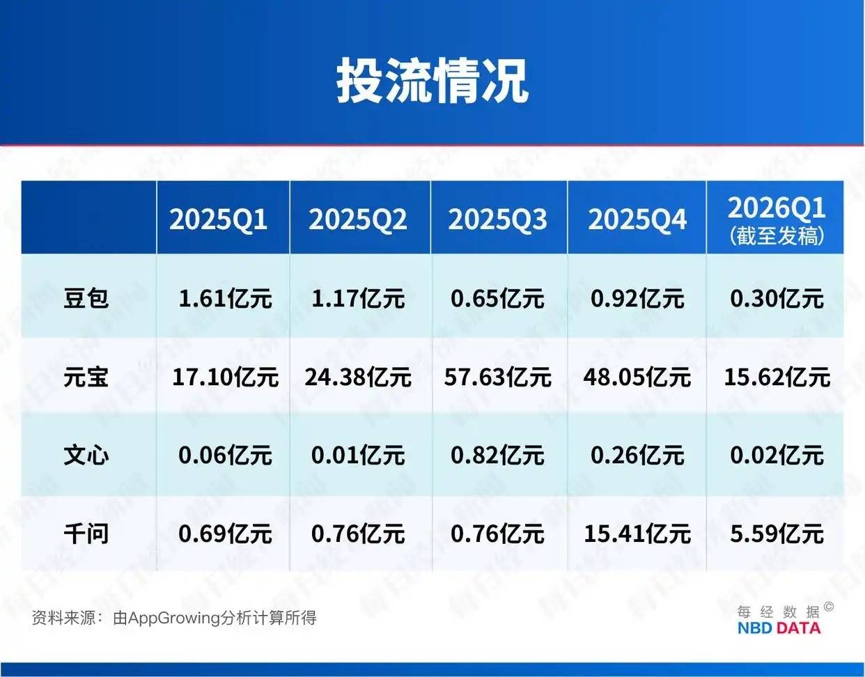 根据AppGrowing估算,元宝在2025年投流高达150亿元。其中,单第三季度投流就高达57.63亿元,而豆包、千问、文心同期投流均不到1亿元。从全年来看,后面三者2025年全年的投流总和(23.12亿元)也赶不上元宝的单季投流。然而,随着绑定DeepSeek所带来的红利期逐渐过去,大力投流所带来的回报比已经开始下滑。