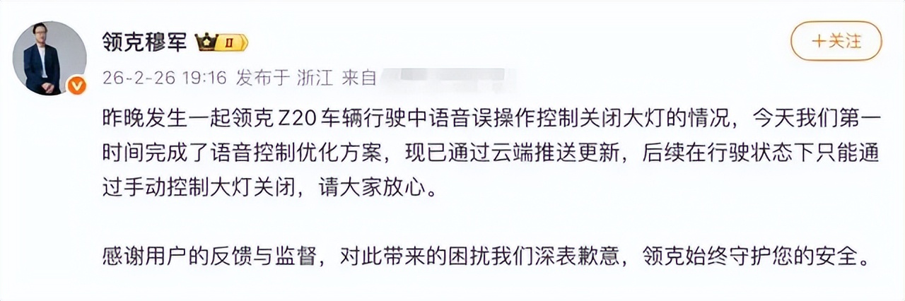 舆论发酵后,领克汽车销售有限公司(下同“领克)副总经理穆军在社交媒体称,“昨晚发生一起领克Z20车辆行驶中语音误操作控制关闭大灯的情况,今天我们第一时间完成了语音控制优化方案,现已通过云端推送更新,后续在行驶状态下只能通过手动控制大灯关闭”。